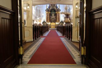 Kirchenteppiche. Der rote Webteppich "Perlon Rips" passt farblich