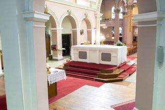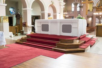 die ebenfalls aus Veloursstoff sind, wurden dem Altarpodest